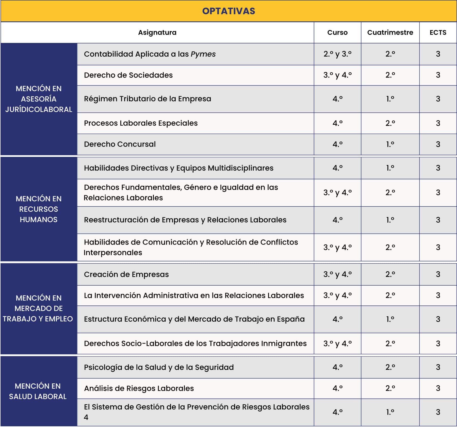 La optatividad está formada por asignaturas que, por un lado, tienen un fuerte componente profesional, práctico y aplicado de los conocimientos adquiridos, para lo cual, además, se ordena en atención a los referidos perfiles o itinerarios profesionales, y, por otro, suponen una apuesta decidida por la igualdad y la diversidad como valor añadido de las empresas. Entre otras cosas, se concreta en: